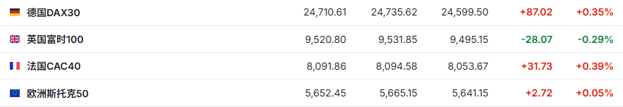2. 截至发稿,德国DAX指数涨0.35%,英国富时100指数跌0.29%,法国CAC40指数涨0.39%,欧洲斯托克50指数涨0.05%。