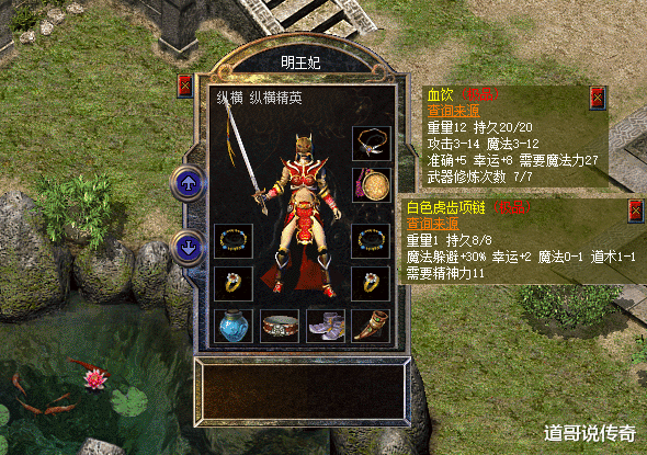 第二,运十套搭配运十套的法师本来就少见,但是像上图中的这种搭配就属于其中最强的存在了。一把血饮是魔12运8的属性,目前综合属性是巅峰;而那根白色虎齿项链更加亮眼,它不仅有运2魔1的属性,而且还多加了10%魔法躲避属性。如此运十套的价值估计要超过20个了。