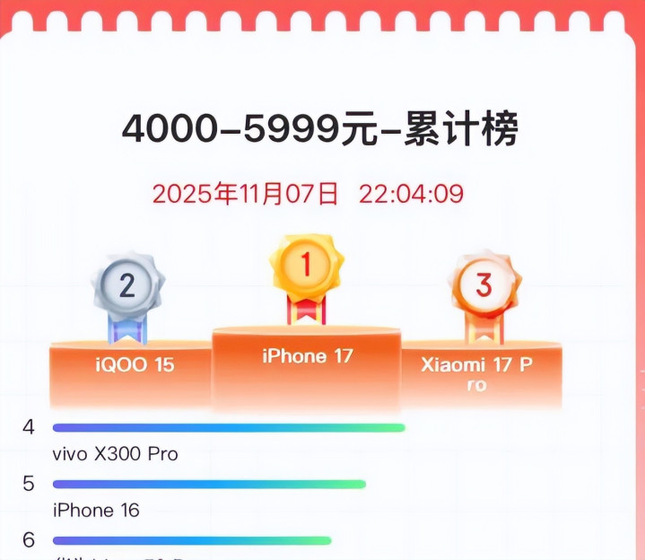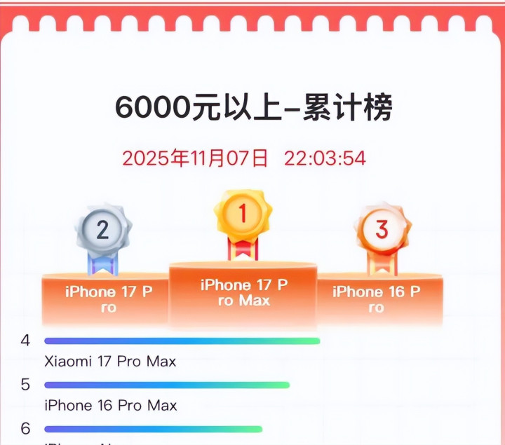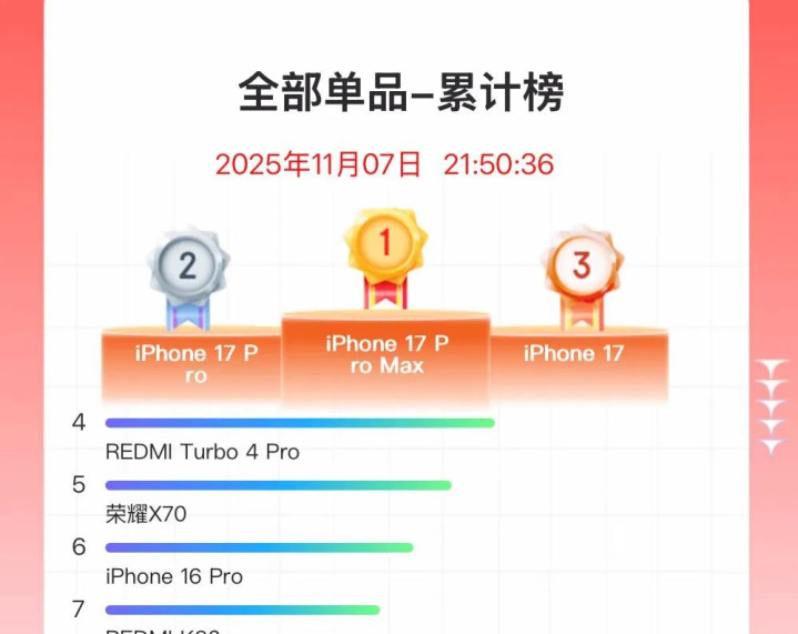 截至11月7日晚10点,京东平台手机累计销量榜前三名全部被iPhone17系列包揽。其中,iPhone17 Pro Max稳坐头把交椅,印证了发布前业内对其“只要价格不变,销量必然火爆”的预测。