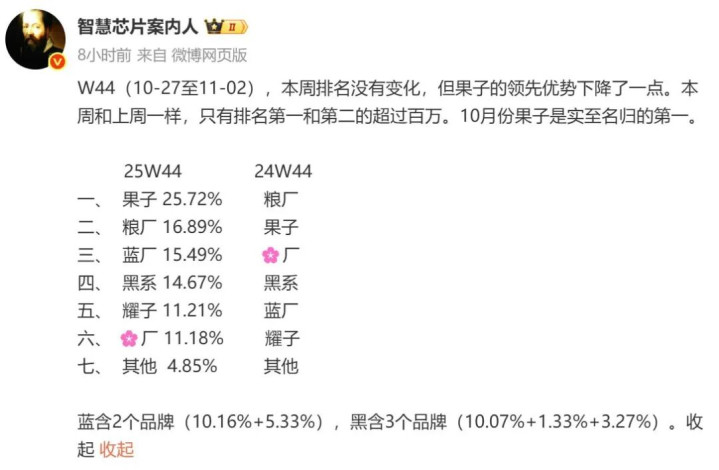 苹果在本次双十一的强势表现,直接反映在了市场份额数据上。根据最新统计,苹果在中国市场的份额已攀升至25.72%,连续四周稳居第一。与此同时,曾经的主要竞争对手华为,市场份额已降至11.18%。