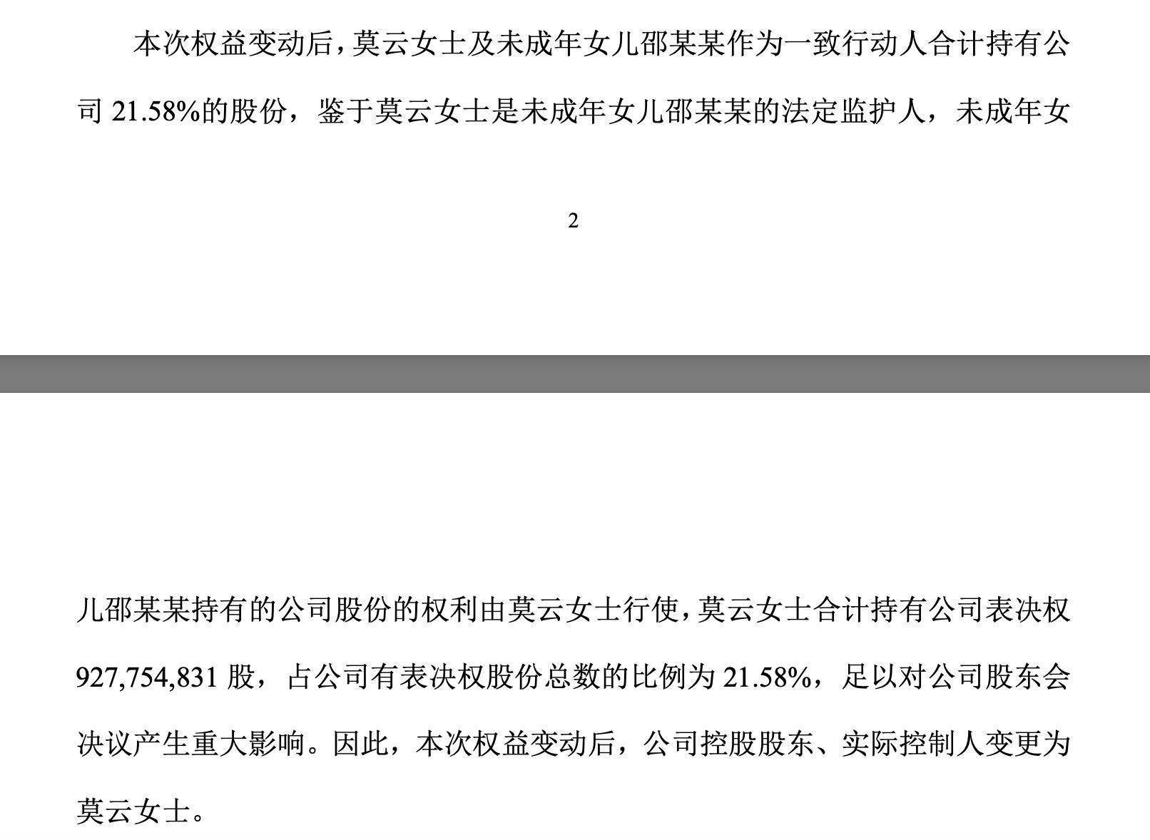 本次权益变动后,莫云女士及未成年女儿邵某某作为一致行动人合计持有公司 21.58%的股份,鉴于莫云女士是未成年女儿邵某某的法定监护人,未成年女儿邵某某持有的公司股份的权利由莫云女士行使,莫云女士合计持有公司表决权927,754,831 股,占公司有表决权股份总数的比例为 21.58%,足以对公司股东会决议产生重大影响。 因此,本次权益变动后,公司控股股东、实际控制人变更为莫云女士。