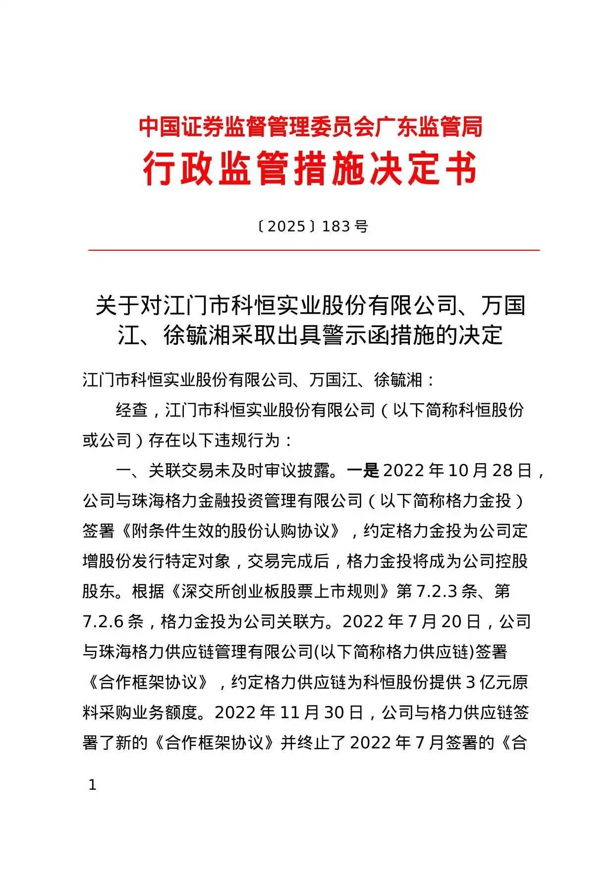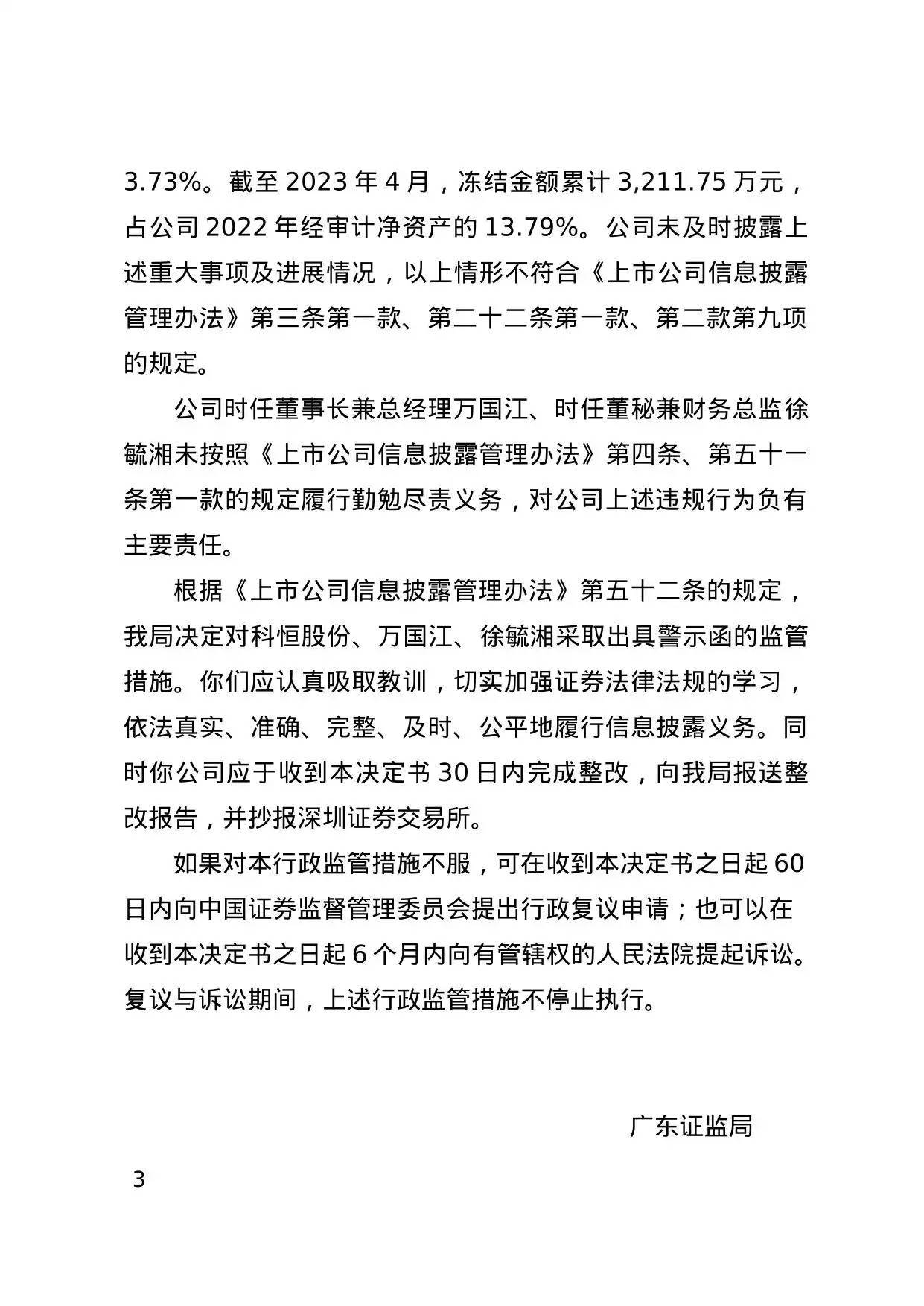 对此,广东证监局决定对科恒股份、万国江、徐毓湘采取出具警示函的监管措施。
